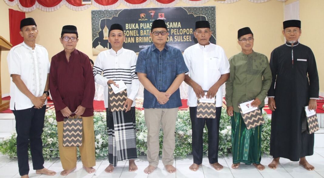 SPEDISIA-WATAMPONE,-Suasana penuh kebersamaam dan kehangatan terasa saat personel Satuan Brimob Polda Sulawesi Selatan menggelar kegiatan buka puasa bersama yang dirangkaikan dengan pembagian ratusan paket Ramadan kepada anak yatim dan tali kasih bagi pengurus masjid, (Sabtu, 07 Maret 2026)