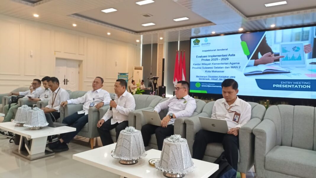 SPEDISIA—MAKASSAR, Inspektorat Jenderal (Itjen) Kementerian Agama Republik Indonesia melaksanakan Entry Meeting Evaluasi Implementasi Program Asta Protas pada lingkungan Kantor Wilayah Kementerian Agama Provinsi Sulawesi Selatan. Kegiatan ini berlangsung di Aula Lantai 2 Kanwil Kemenag Sulsel, Selasa 16 Desember 2025.